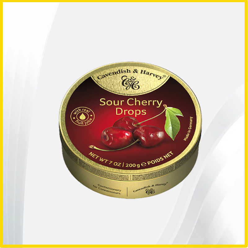 - Our Sour Cherry Drops, made with real fruit juice, are dusted with icing sugar and sealed in a premium gold tin for the highest quality freshness