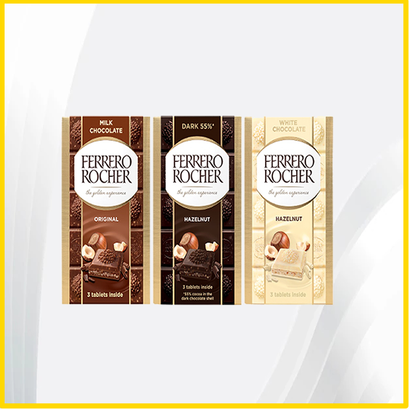 - Discover the NEW Ferrero Rocher Chocolate Bars, created for all chocolate lovers. Inspired by the iconic Ferrero Rocher specialties, to bring you another dimension of delicious sensation of textures and flavours. Made only with carefully selected ingredients: crunchy hazelnut pieces, delicious chocolate and exquisite creamy fillings. All combined in distinctive layers to take your taste buds for an indulgent journey.