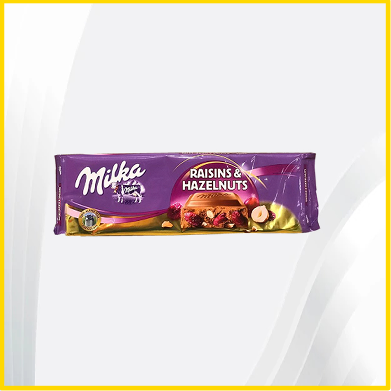 Beloved Milka is ready to please you with a combination of delicate milk chocolate with juicy raisins and whole hazelnuts. Each piece is filled with an amazing taste of tenderness and love.